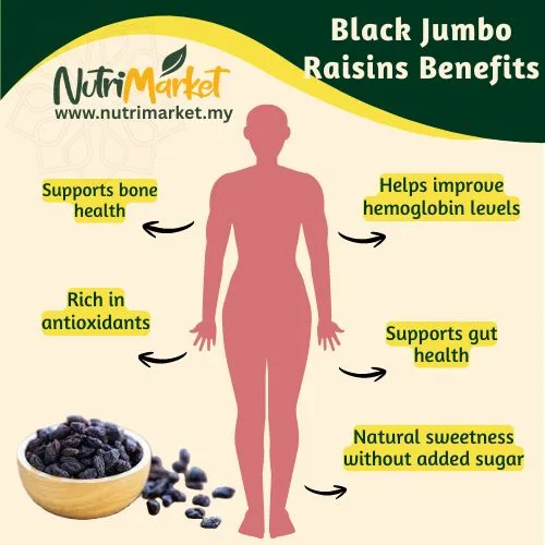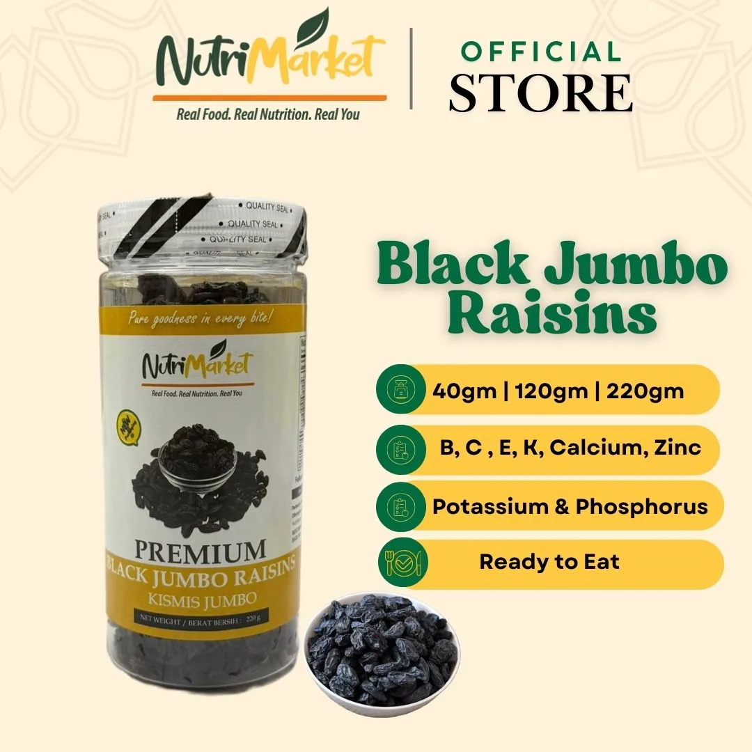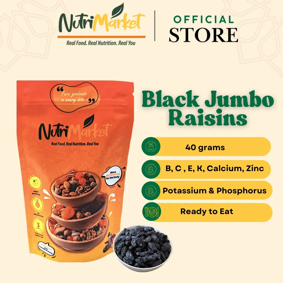 Sealed for lasting freshness and packed with care, NUTRI MARKET’s Jumbo Black Raisins