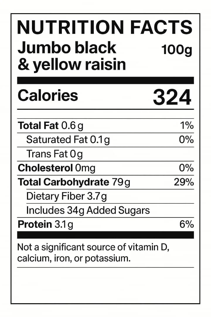 🌿 Ingredients: 100% Jumbo Black Raisins, Yellow Raisins.